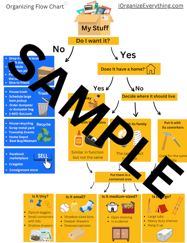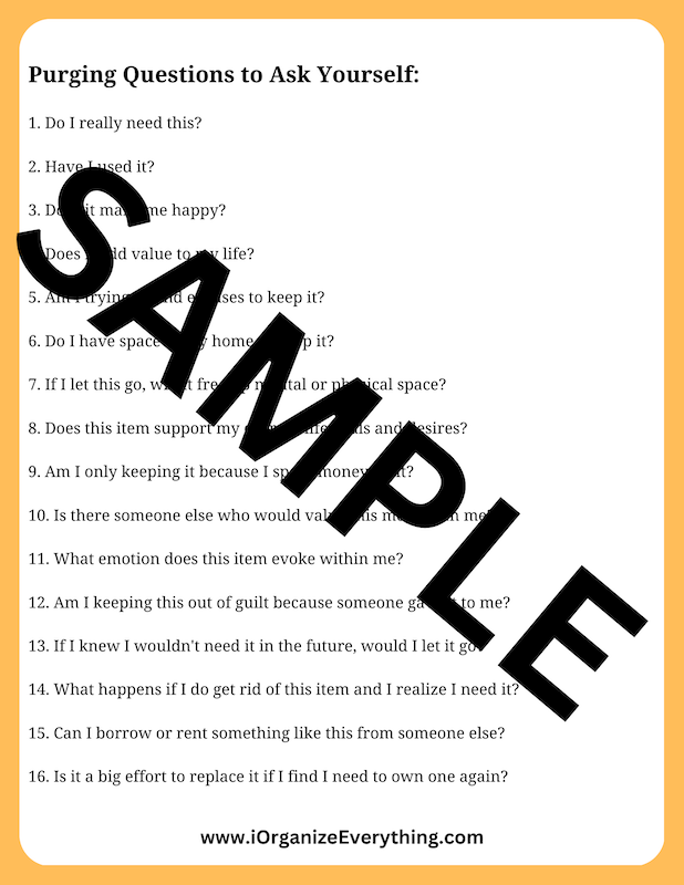 You'll get the "How To Organize Everything" ebook, along with 2 helpful print outs as a bonus for buying from Gumroad. 1. Organizing Flow Chart 2. Purging Questions to Ask Yourself (It is not the complete Purging Questions list which is offered separately)