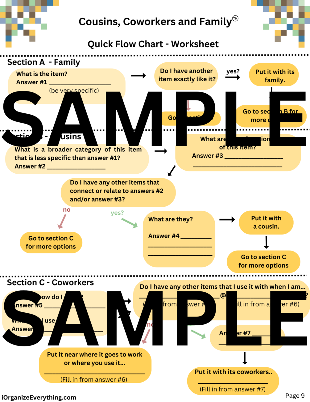 What it won't do. Our worksheets focus solely on the sorting process, aiding you in creating categories for items you've decided to keep. However, it doesn't delve into the purging process; it assumes you've already made the decision to retain these items. Additionally, the CCF method won't provide solutions for the containing process, where you choose containers or organizing systems. Instead, it may lead you to discover pre-existing homes or systems, but can also lead you to creating new ones.